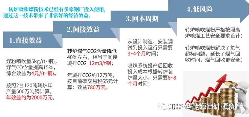 转炉冶炼前期和后期,由于炉气中氧气含量超标,无法回收,只好放散。虽然采取了点燃措施,但是由于煤气热值低及点燃点温度低,实际很少能够点燃。煤气回收限制性条件主要是防止回收爆炸性混合气体,它是安全进行煤气回收的基本条件。在确保有足够的煤气柜容量的条件下, 煤气回收的操作条件也是影响转炉煤气回收的主要因素。 煤气回收以烟气中的 CO 和 O2 含量为依据:CO 浓度不低于预定值,且 O2 浓度不高于预订值。 一般钢铁企业将该条件设置为 CO 不低于 30%,且 O2 不高于2%。 由于转炉煤气在正常吹炼的前期和后期CO往往低于30%,无法回收,需要对空放散,造成了环境污染与能源浪费,转炉喷煤技术则是利用高温喷煤,将烟气中CO2与C反应生成CO,提升CO浓度,提高转炉煤气的回收利用。向转炉内喷煤粉,冶炼全程回收煤气,利用炉内高温余热干馏煤粉,实现转炉冶炼低碳、绿色、环保多重效益。(2)转炉喷煤技术介绍 转炉煤气是钢铁企业重要的二次能源,占炼钢工序能源回收总量的80%~90%,转炉煤气主要用于冶金包烘烤、钢坯加热、化工产品生产和燃气发电等。 在转炉冶炼期间通过在转炉汽化烟道活动烟罩或移动段喷吹煤粉,在1000℃以上高温工况下使煤粉中的C与转炉烟气中的CO2发生还原反应,生成2mol的CO,既可以提高煤气回收时间、也可以提高回收煤气的热值。(3)经济效益